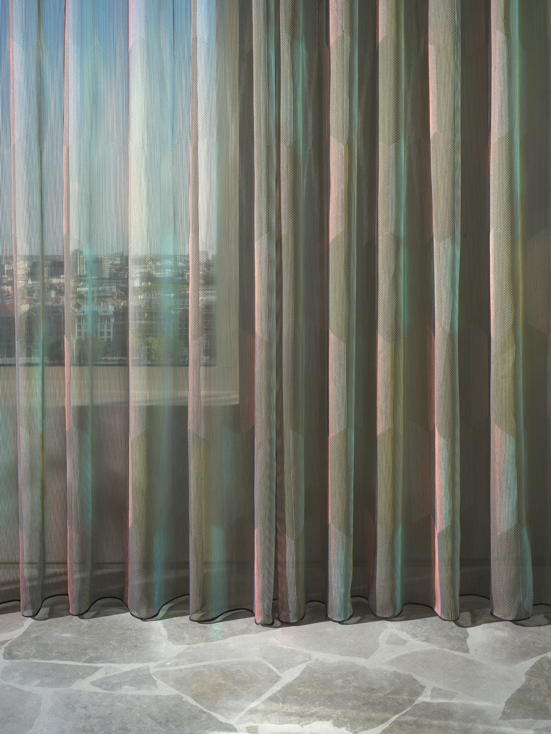 Het ritmische blokdessin doet denken aan traditioneel glaswerk: gelaagd, ambachtelijk en verfijnd. De complexe wisselwerking tussen ketting en inslag, en tussen matte en glanzende garens, zorgt voor subtiele kleurverlopen en een bijna hypnotiserende diepte. Hierdoor oogt Morph nooit statisch, maar leeft en beweegt het dessin mee met zijn omgeving, een combinatie van grafiek en tactiliteit die de stof bijzonder geschikt maakt voor hedendaagse interieurs.